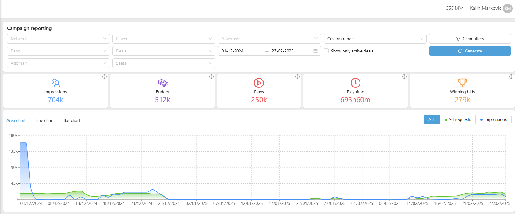 Campaign Reporting is best used when evaluating campaign delivery and performance. Similar to Inventory Reporting, it provides total values for impressions, ad requests, plays, winning bids, spend, and revenue for the selected reporting period, but with the added ability to break this data down by advertiser, deal, DSP, and player. This makes Campaign Reporting the primary tool for validating campaign delivery, budget pacing, and advertiser performance over a defined timeframe.