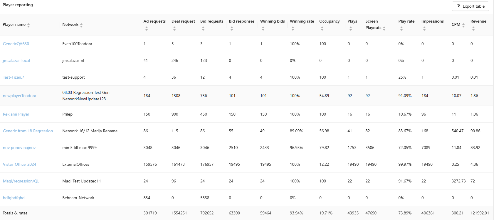This section provides detailed performance metrics for each player in the selected campaigns. Each player is identified by Name and Network.