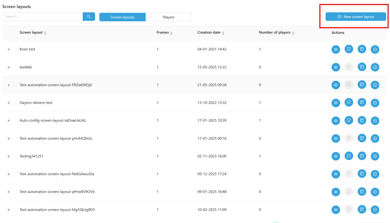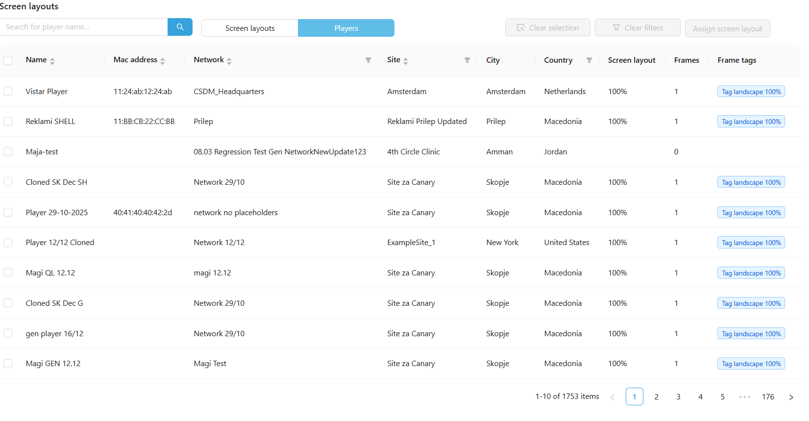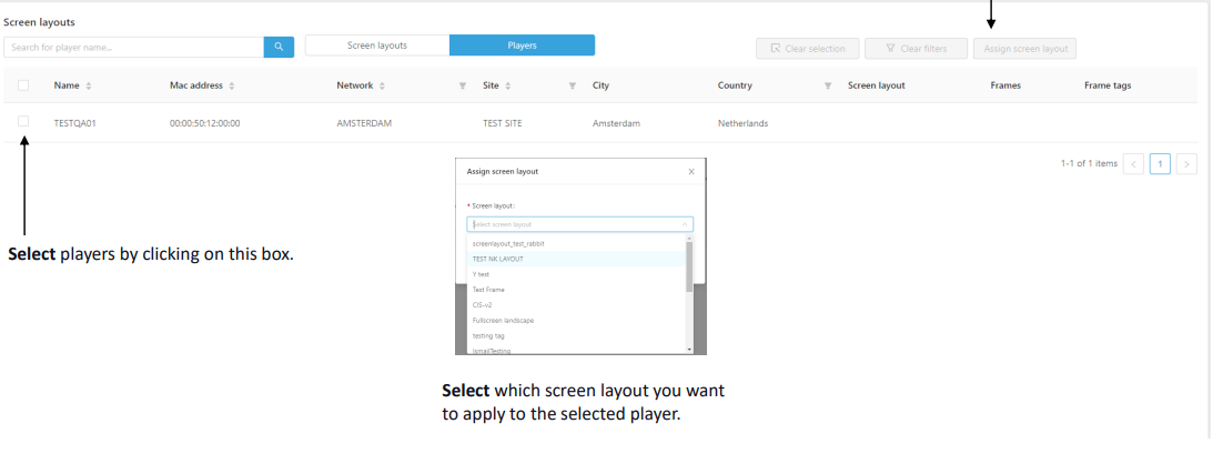 By selecting players you will get on this page. Here it is possible to select a player and add a screen layout to it. This will make sure that the selected player will make use of the created Screen Layout.
