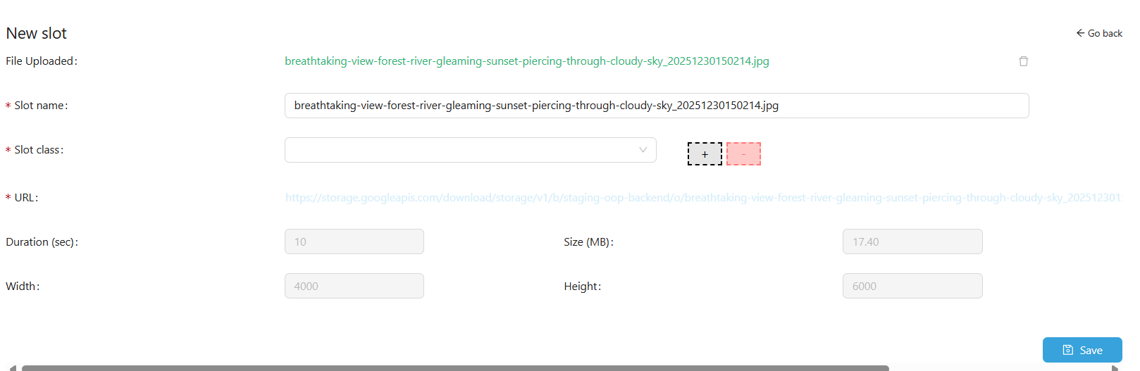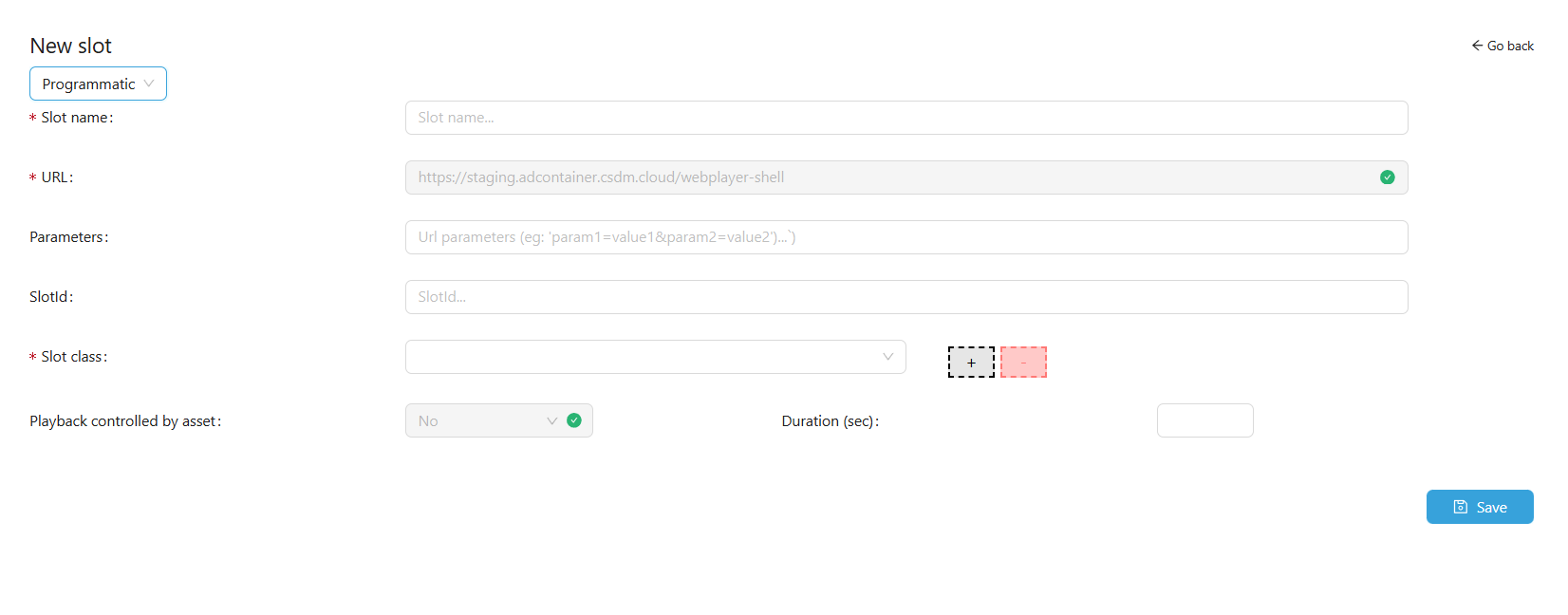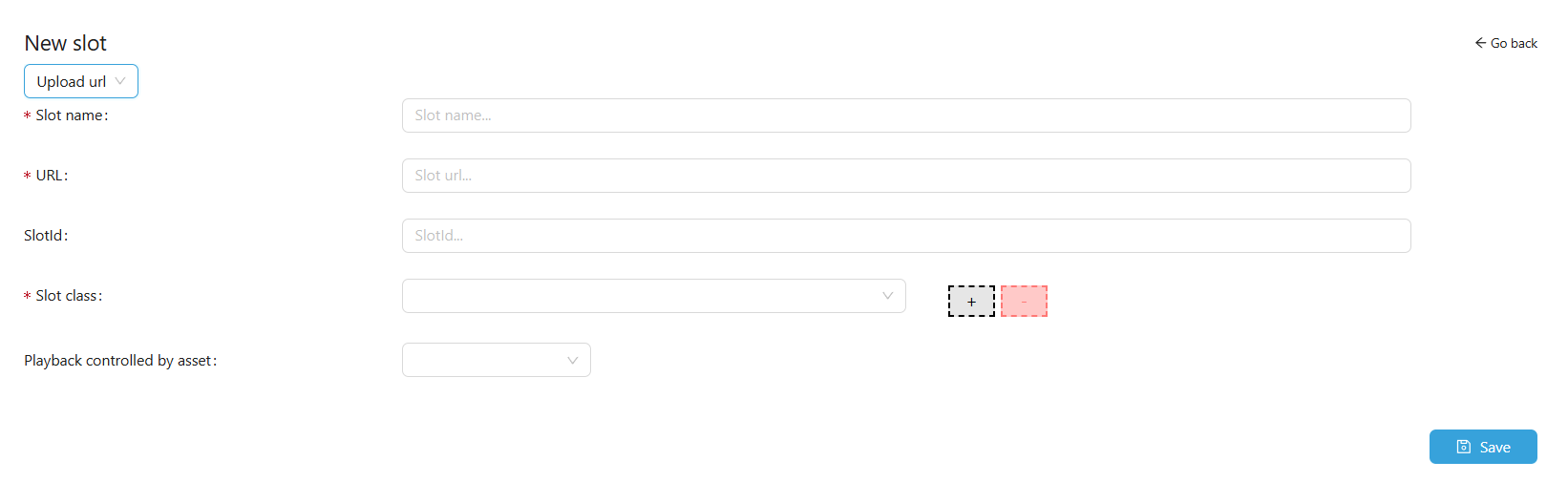 Slot Class – Choose the appropriate class from the dropdown (e.g., Linear for images). Use the gray + button to create a new class or the red – button to delete classes; required.